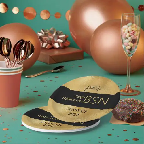 12. BSN NURSE Graduation RN LPN Name Black Faux Gold Paper Plates
