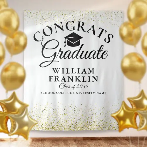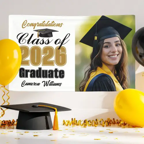 This banner highlights the graduate’s achievement in a personal way, helping your decor feel more meaningful while still blending seamlessly into your black and gold color palette.