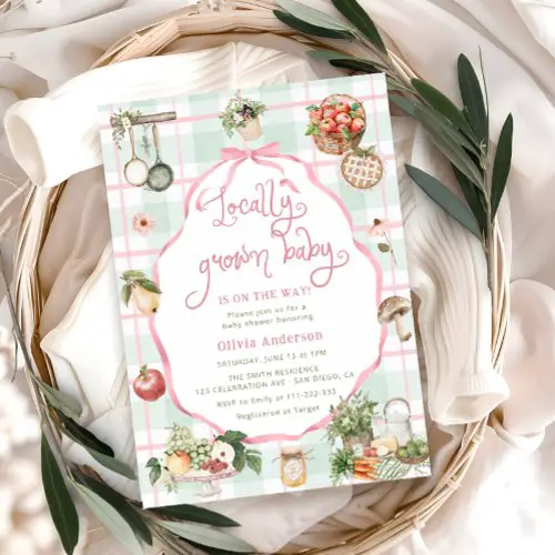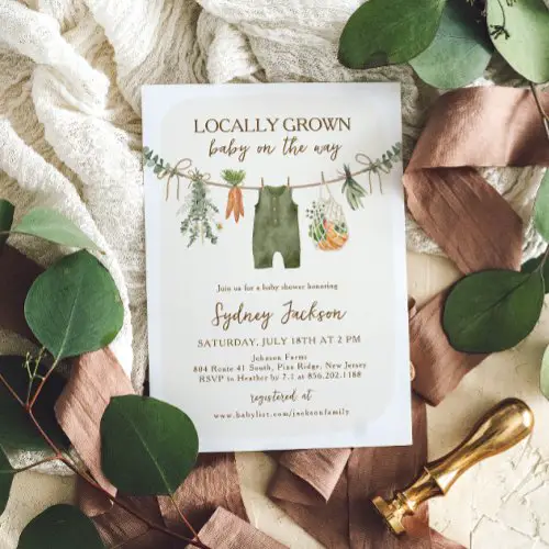 8. Pixel PerfectionPartyLTD Farmers Market Baby Shower “Locally Grown Baby” Invitation