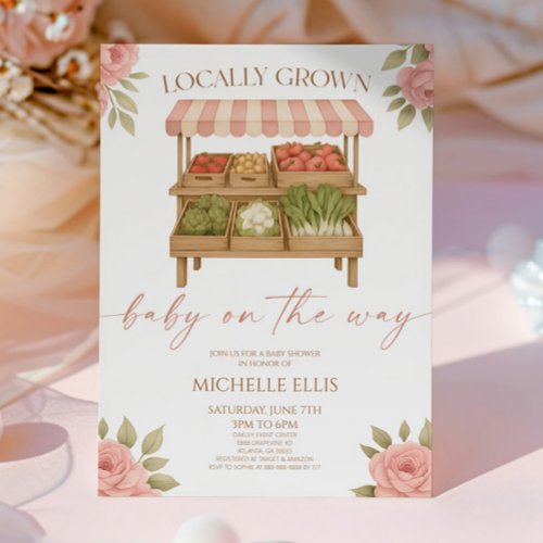 16. JermolinaArtLTD Farmers Market “Locally Grown” Pink Baby Shower Invitation