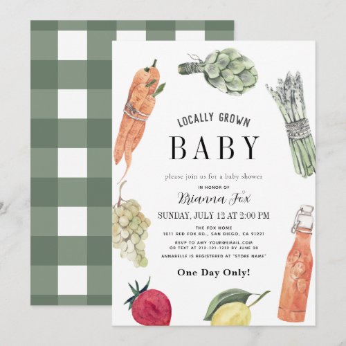 This invitation blends a fresh farmers market aesthetic with a sweet “locally grown baby” theme.
