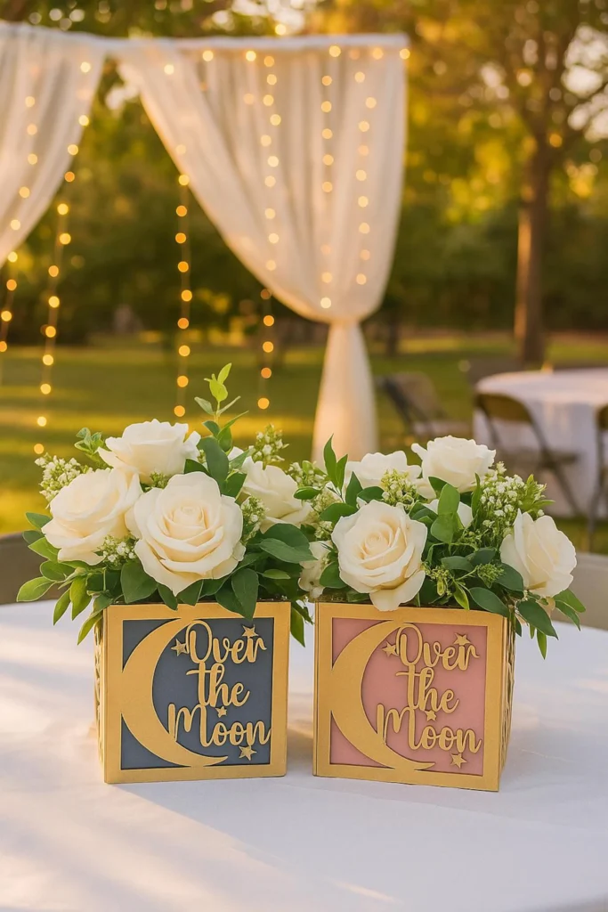 Celestial moon centerpiece adds height, elegance, and a dreamy focal point to your baby shower table