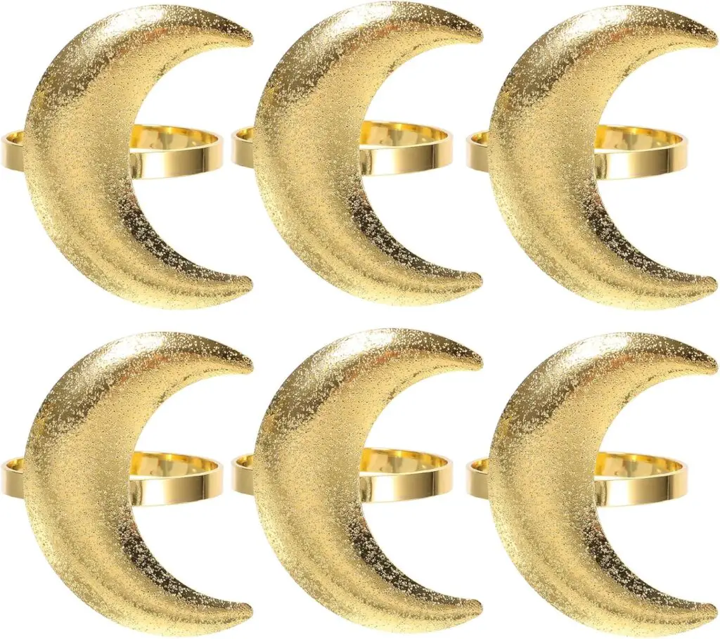 Moon-shaped napkin rings and elegantly folded linens in celestial hues.