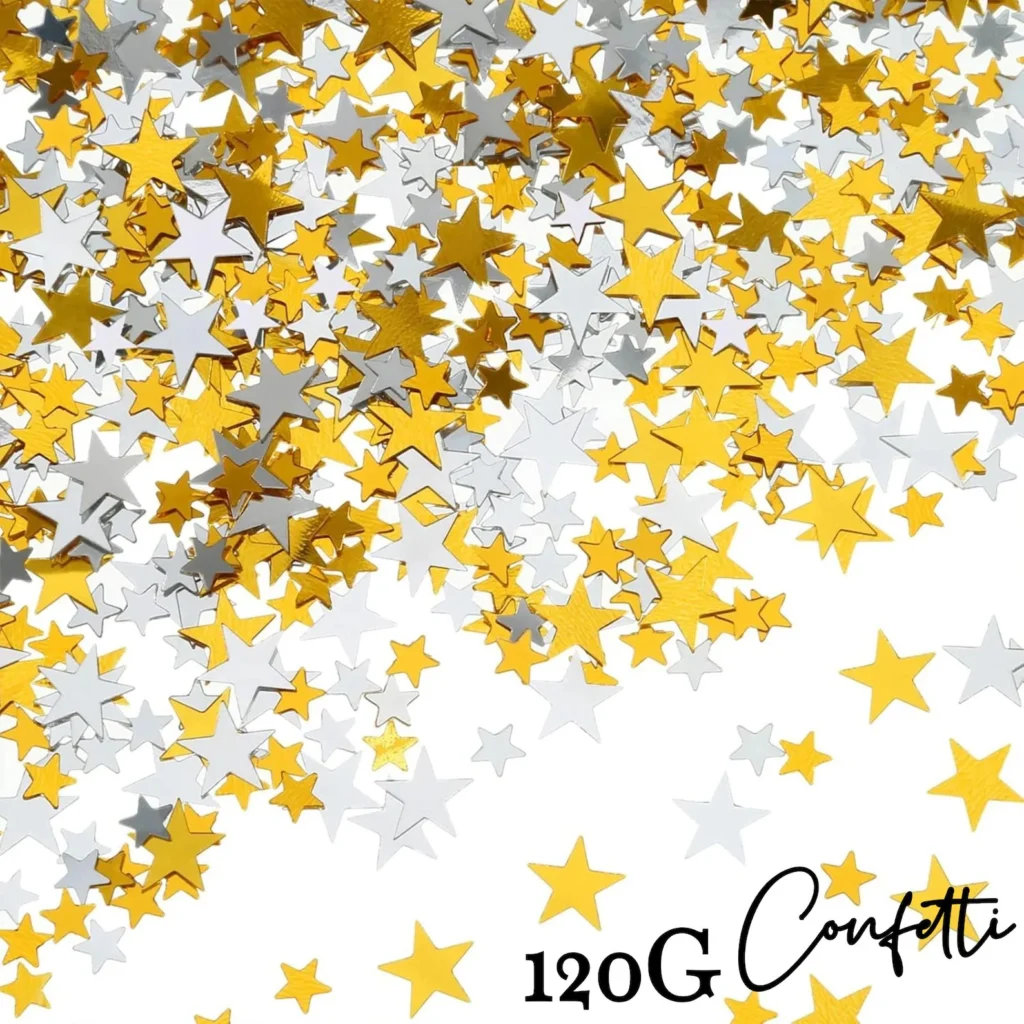 Gold and silver star confetti adds sparkle, texture, and a polished finishing touch to tables.old and silver star confetti.