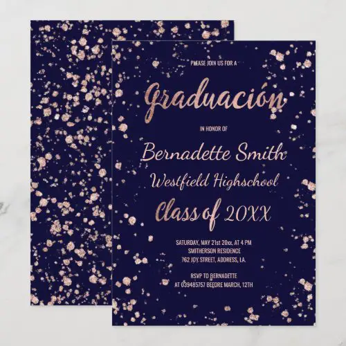 11. Navy Rose Gold Confetti Graduation Spanish Invitation