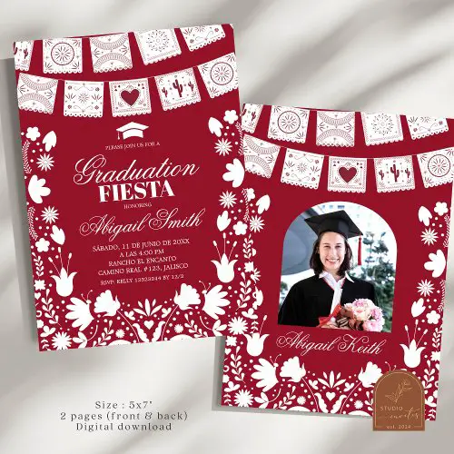 This red and maroon Talavera graduation invitation delivers a deeper, more refined color palette while still embracing cultural detail, creating a balanced design that feels both festive and elegant for a memorable graduation celebration.