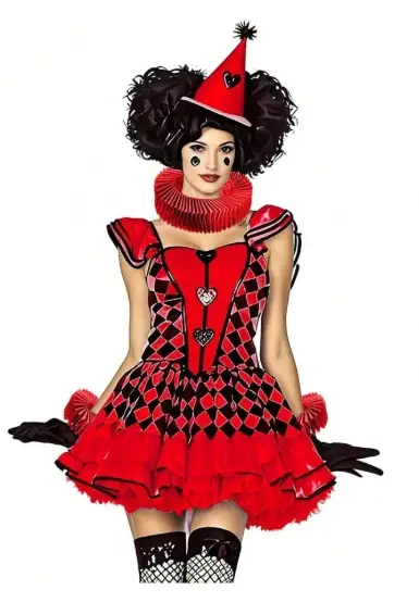 With its ruffled collar, layered tulle skirt, and bold diamond print, it delivers a hauntingly glamorous take on classic circus horror.