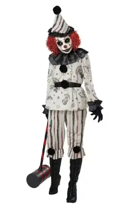 With its ruffled collar, striped leggings, suspenders, and classic hat, it channels timeless circus style with a haunting vintage edge.