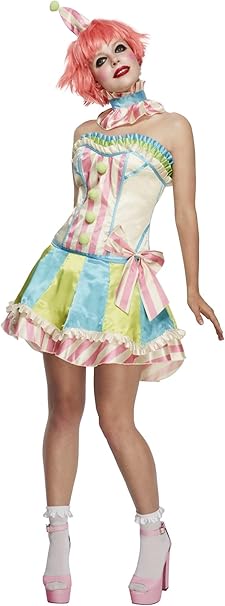 Featuring a tulle tutu dress, striped leggings, and conical hat, it’s the perfect blend of playful horror and retro circus elegance.