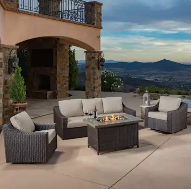 This set combines deep wicker seating with a built-in fire feature, creating a natural gathering spot.