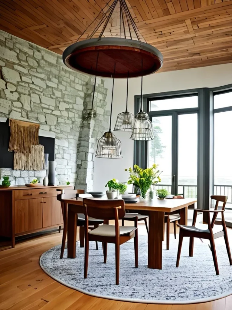 It adds warmth and character to dining rooms, kitchens, or event spaces while creating a strong, eye-catching focal point overhead.
