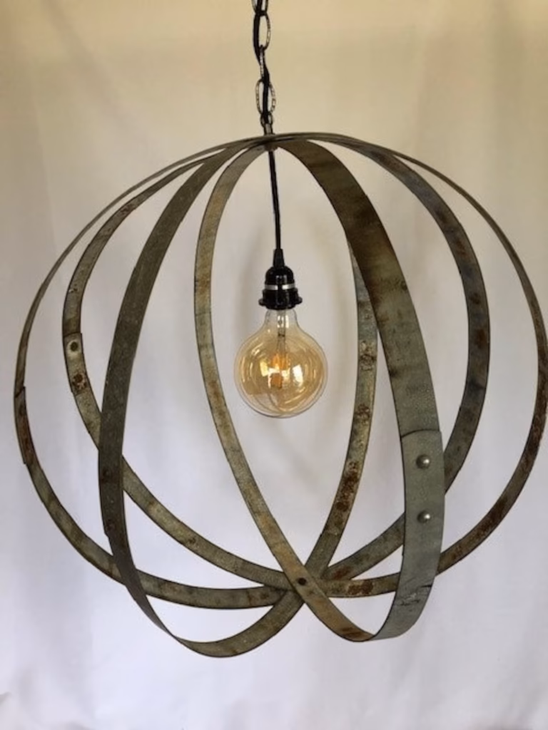 This galvanized wine barrel hoop light brings a clean, industrial edge to rustic décor.